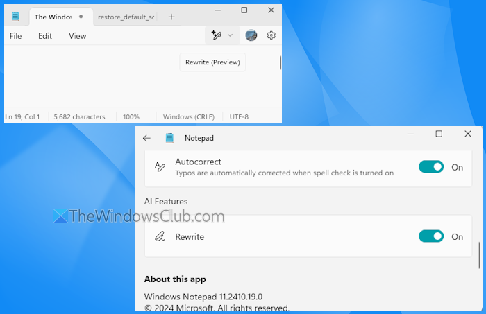 如果重寫圖示不存在,請開啟 Windows 記事本設定並向下捲動到人工智慧特點部分。在那裡你會看到一個改寫選項。使用切換開關開啟/關閉。