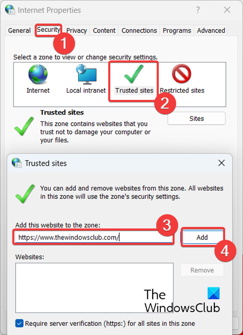 - 之後,輸入您要添加到受信任站點的站點的網址,然後單擊添加按鈕。