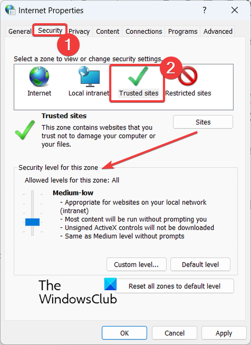 如果您在受信任的網站上收到錯誤,您可以將其添加到“Internet 選項”中的受信任站點列表中。以下是執行此操作的步驟: