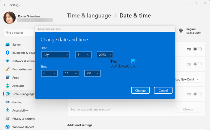 如果您已啟用上述選項但顯示的日期和時間不正確,您可以手動設置正確的日期和時間。為此,請關閉自動設置時間開關,然後單擊改變與關聯的按鈕手動設置日期和時間選項。