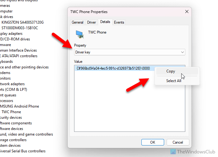 然後,前往細節選項卡,展開財產下拉列表,然後選擇駕駛員鑰匙。接下來,右鍵單擊驅動程序密鑰並選擇複製選項。