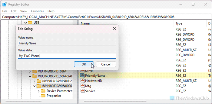 要在設備管理器中更改 CPU 名稱,您需要復制 CPU 的驅動程序密鑰。您必須擴展處理器部分,選擇特性選項,然後轉到細節選項卡。接下來,您需要打開註冊表編輯器並轉到枚舉在香港LM。搜索驅動程序密鑰並雙擊FriendlyName 字符串值。然後,輸入新名稱並單擊後重新啟動計算機好的按鈕。