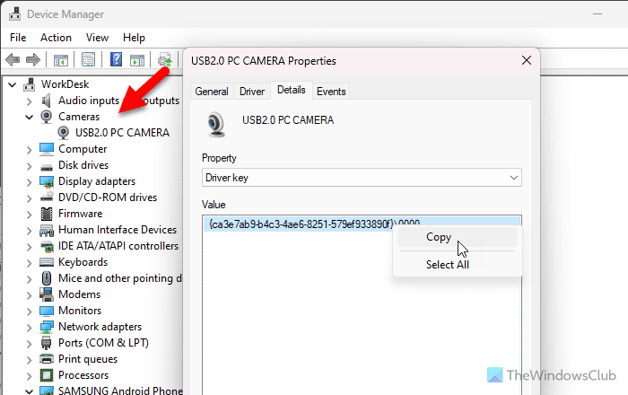 要在Windows 11/10中重命名USB攝像頭,您需要先打開設備管理器。然後,展開相機部分,右鍵單擊現有相機硬件,選擇特性選項,然後切換到細節選項卡。