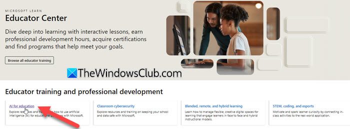 單擊教育中心頂部菜單並選擇概述。向下滾動一點並單擊人工智能教育在下面教育者培訓和專業發展。在下面教育中心培訓, 點擊面向教育工作者的人工智能。