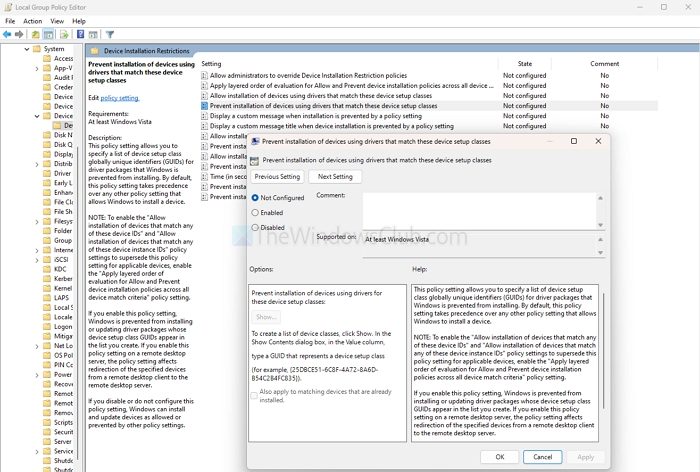 Computer Configuration > Administrative Templates > System > Device Installation > Device Installation Restrictions - 啟用設置:
