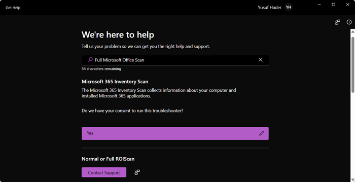 計算機上的“獲取幫助”應用程序打開後,系統會要求您單擊是的授予您運行疑難解答程序的權限。