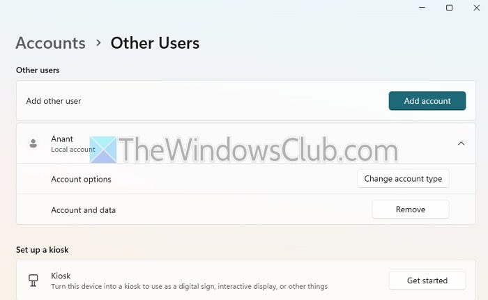- 使用本機帳戶,然後前往 Windows PC 上的「設定」>「帳戶」>「其他使用者」。