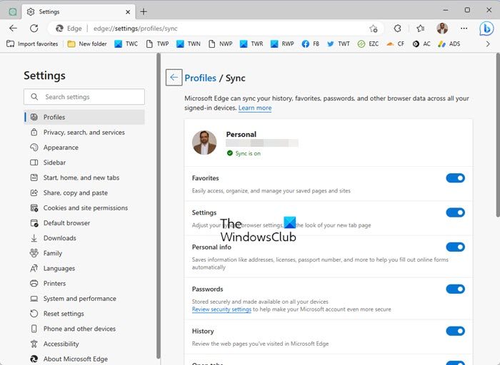 如果您登錄了一個配置文件,瀏覽歷史記錄和其他數據未顯示在此設備上,而是在其他設備上顯示,則應檢查您的同步設置。在Microsoft Edge的“設置”頁面中,請轉到配置文件>同步。之後,。檢查是否歷史按鈕在同步選項下打開。如果沒有,請啟用它,因為它可能是您瀏覽歷史記錄未顯示的原因。您還應該檢查其他同步選項,例如最愛,,,,密碼, 和設定等等,如果您面臨這些同步問題。
