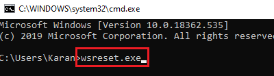 重置 Microsoft Store 可解決大多數情況下的問題。重置它,看看是否有幫助。如果 Microsoft Store 打開,請將其關閉,然後打開命令提示符,鍵入以下命令,然後按進入。