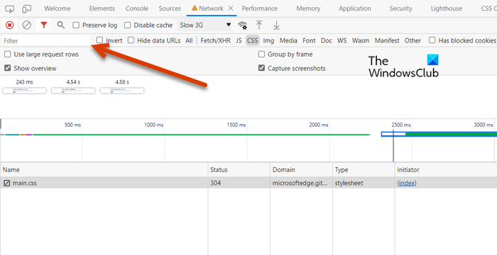 一個也可以按資源類型過濾。例如,如果單擊 CSS 按鈕,則所有其他資源類型都將被過濾掉。