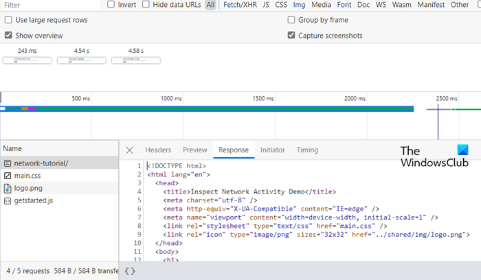 我們還可以查看來源的詳細信息來了解更多信息。做同樣的事情非常簡單。點擊網絡教程從網絡日誌的名稱列。這將打開一個帶有多個選項卡的新窗口。您可以點擊預覽要了解您的頁面的外觀,請訪問回覆了解 HTML 代碼,然後定時了解網絡活動。