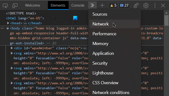 打開 DevTools 後,單擊網絡選項卡訪問網絡工具。如果沒有“網絡”選項卡,請單擊箭頭 (>>) 按鈕,然後選擇“網絡”。