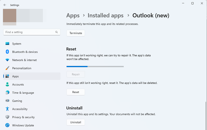 如果問題是由應用程序文件損壞或安裝損壞引起的,修復或重置 New Outlook 有助於解決問題。