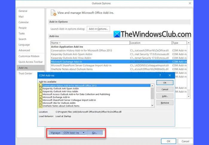 在 Windows 搜索欄中輸入“outlook”並選擇展望(經典)從搜索結果中。前往文件 > 選項 > 加載項。在窗口底部,單擊去旁邊管理:COM 加載項。取消選中您懷疑可能導致問題的任何第三方或不必要的加載項。點擊好的應用更改。然後關閉經典 Outlook 並嘗試再次啟動新 Outlook。
