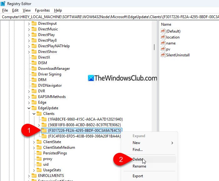 筆記:一些高級用戶建議刪除特定的註冊表項有助於強制干淨地重新安裝 WebView2。此步驟是可選的,僅當您習慣使用註冊表編輯器時才建議執行此步驟(錯誤地編輯註冊表可能會導致系統出現嚴重問題。總是進行更改之前)。