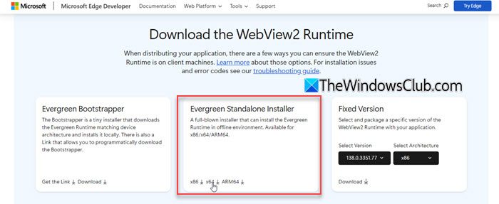 訪問微軟官方WebView2下載頁面:點擊這裡。向下滾動到Evergreen 獨立安裝程序並下載合適的版本。下載後,右鍵單擊安裝程序並選擇以管理員身份運行。按照屏幕上的提示進行操作。如果WebView2已經安裝,則會修復它;如果丟失,它將安裝一個新的副本。