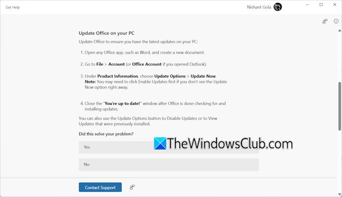 “獲取幫助”應用程序將向您顯示一條建議,您必須嘗試並檢查它是否有效。就我而言,它建議手動檢查 Office 更新並安裝相同的更新(如果有)。如果該建議解決了您的問題,請選擇“是”,否則選擇“否”。當您選擇“否”時,它將建議您進行其他修復。