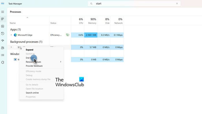 由於“開始”菜單中的電源按鈕沒有任何作用,我們將。為此,請打開任務管理器,查找“開始”,右鍵單擊它,然後選擇“結束任務”。完成後,嘗試重新啟動並查看是否有幫助。