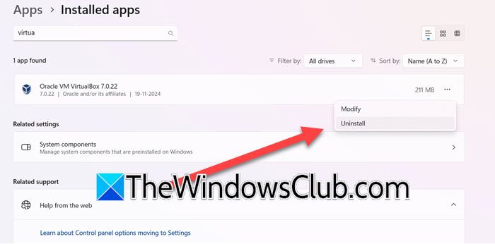 - 選擇三個點選項,然後單擊“卸載”選項。完成後,導航到文件資源管理器並刪除與 VirtualBox 相關的所有文件。