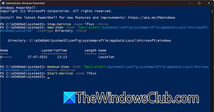 Remove-Item -Path "$env:windir\System32\config\systemprofile\AppData\Local\Microsoft\Windows\Location\*" -Force -Recurse