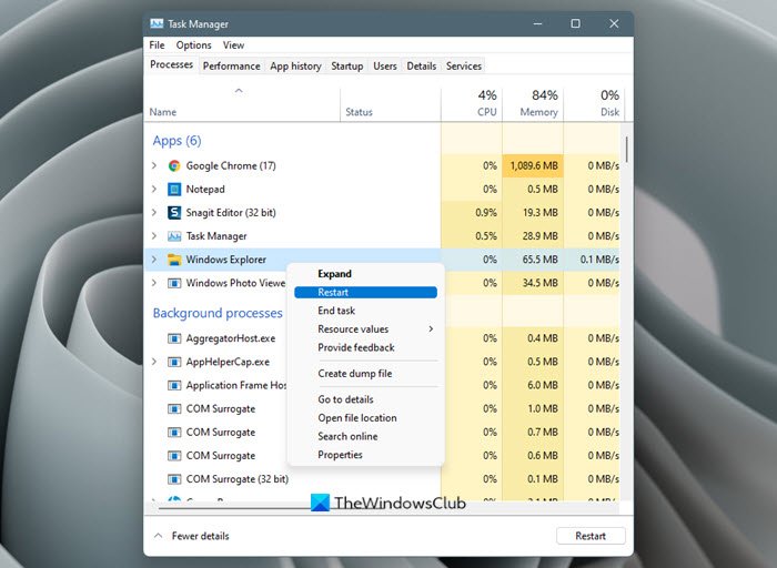 是任務欄相關問題的常見故障排除步驟。這將刷新操作系統的核心圖形界面,而無需完全重新啟動系統。要執行相同的操作,請單擊 Ctrl + Shift + Esc 打開任務管理器,然後導航到“進程”選項卡。在這裡,找到並右鍵單擊 Windows 資源管理器,然後選擇重新啟動選項。嘗試再次將文件拖到任務欄。如果情況仍然相同,請繼續執行下一個解決方案。